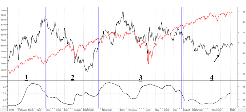 In realtà è dal minimo del 27 novembre (vedi freccia nera) che il rendimento del T-Note è in leggero aumento, con anche l’S&P500 in crescita. Ciò ha portato la correlazione a crescere ed è al limite di un valore positivo.
