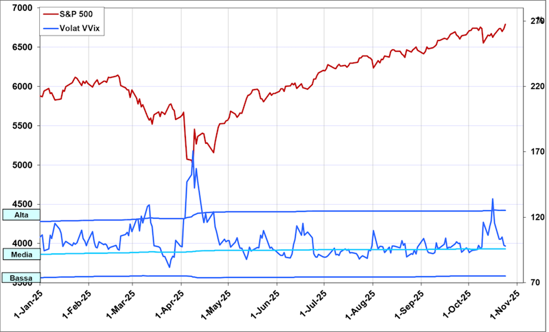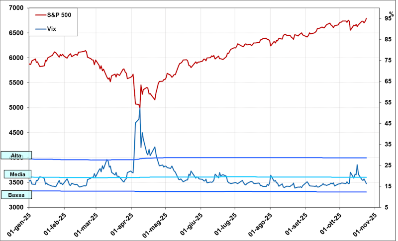 Partiamo con il classico Indice della Volatilità Implicita, ovvero il Vix (dati giornalieri a partire dal gennaio 2025 e sino alla chiusura di venerdì 24 ottobre):