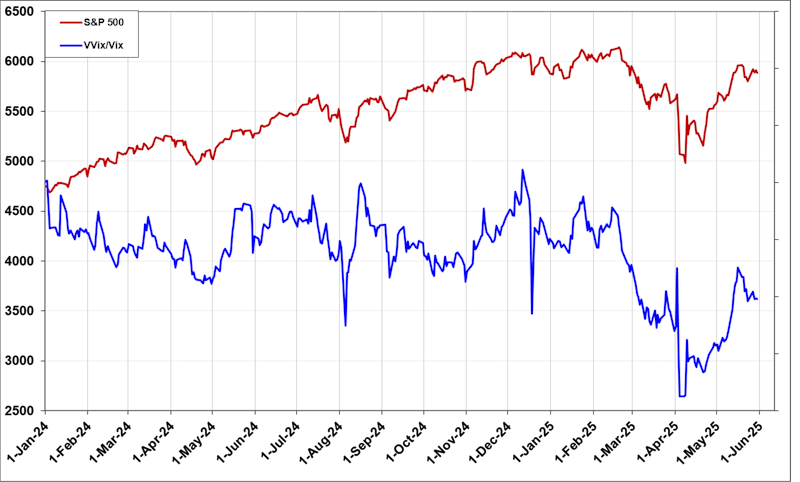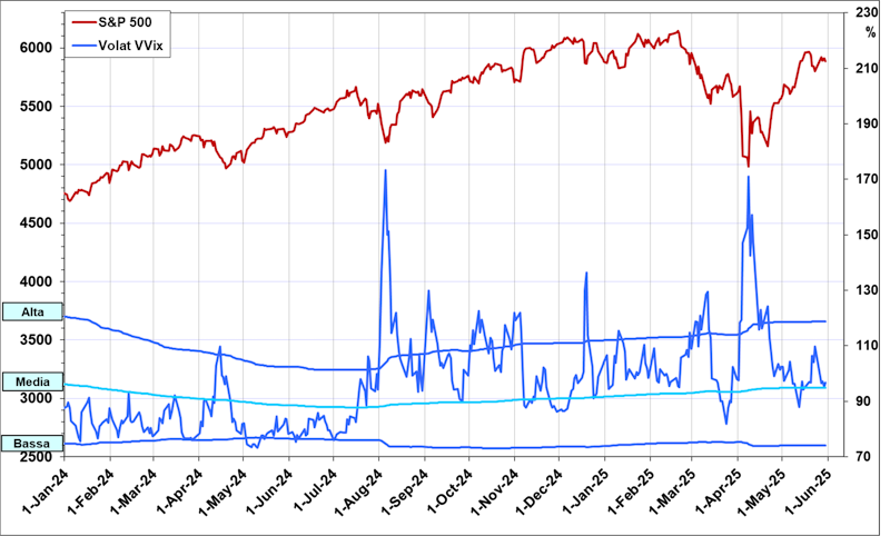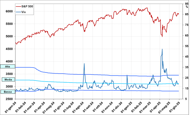 Recentemente il Vix ha fatto un elevato picco massimo l’8 aprile (vedi freccia blu) con valori a quasi 52 punti; era dal marzo 2020 che non si vedevano valori così elevati. In contemporanea l’Indice S&P500 ha fatto un minimo assai evidente (vedi freccia rossa) intorno a 4980 punti. Sappiamo che l’elemento scatenate di questa turbolenza è stato la questione dei dazi Usa minacciati Successivamente il Vix è sceso sono al minimo del 16 maggio (vedi freccia verde) e valori intorno a 17 punti. Ciò è coinciso con il recupero dell’S&P500 sino ad oggi. Tuttavia il Vix sta dando segni di nervosismo con valori intorno alla media storica. Sembra un segnale che l’S&P500 sia in una fase di stanca del recupero di forza.