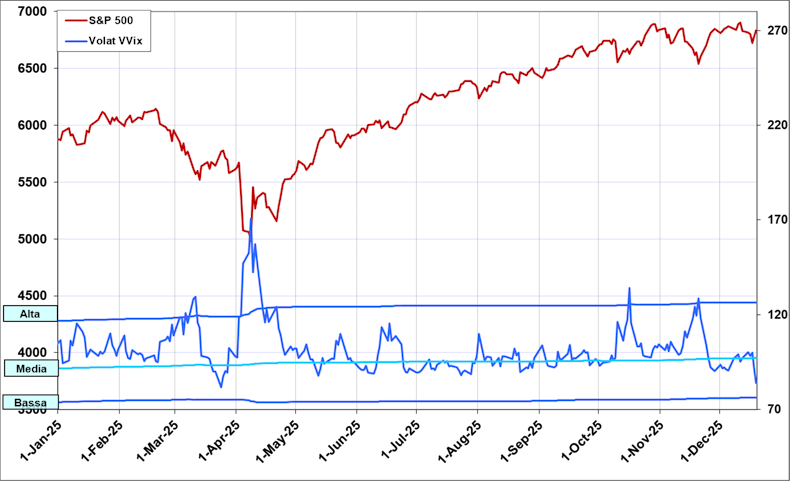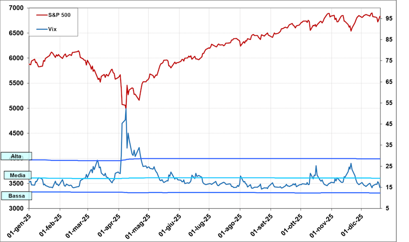 Attualmente il Vix è su livelli mediamente bassi da circa fine novembre (vedi freccia blu) con valori che sono rimasti quasi costantemente sotto all media di lungo periodo che è poco sopra 19.  Si noti come i valori attuali di Vix siano simili ai valori minimali del 2025 raggiunti in altre fasi dell’anno.