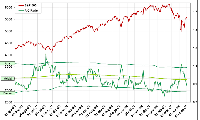 Andiamo anche a vedere un altro indicatore di sentiment legato al mondo delle opzioni: il grafico del Put/Call Ratio (dati giornalieri):