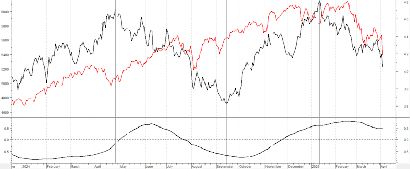 Durante queste 4 fasi del rendimento del T-Note l’Indice S&P500 ha avuto una quasi costante crescita sino al recente 19 febbraio (vedi freccia rossa). La curva della correlazione in basso ci dice come non ci sia stata una relazione costante tra i 2 mercati, cosa che si capisce anche osservando solo i 2 grafici. Abbiamo detto come la correlazione più “naturale” dovrebbe essere quella inversa. Invece, soprattutto dal minimo di rendimento del settembre 2024, la correlazione è evidente come sia diretta con la fase attuale che vede rendimento del T-Note in discesa e valore dell’S&P500 in discesa. Questa situazione è probabilmente legata ad uno stato “confusionale”, ovvero di elevata incertezza, da parte degli operatori, i quali soprattutto nel 2025 sono stati spiazzati dalle continue dichiarazioni sulle politiche commerciali della nuova Amministrazione Usa e dalle possibili ricadute sul sistema economico finanziario.