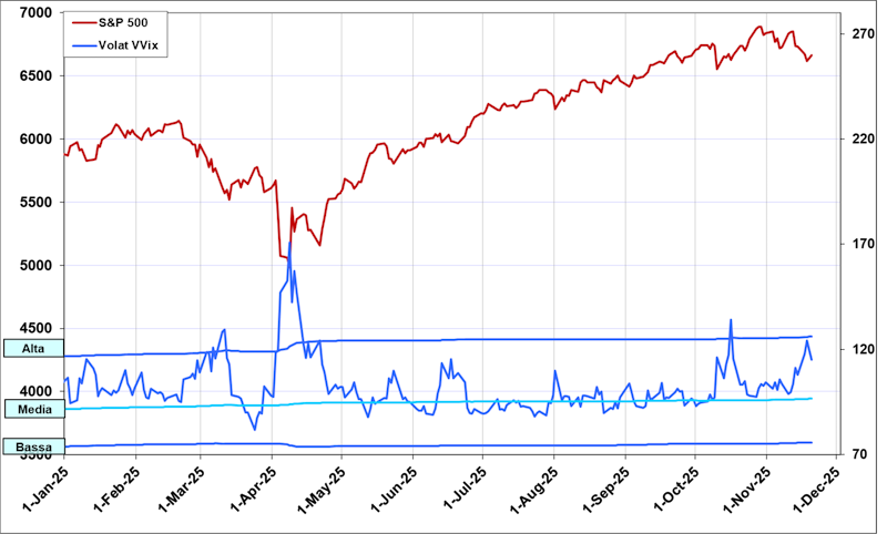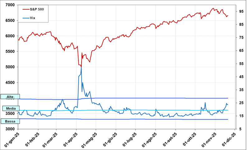 Partiamo con il classico Indice della Volatilità Implicita, ovvero il Vix (dati giornalieri a partire dal gennaio 2025 e sino ai valori di oggi pomeriggio 20 novembre):