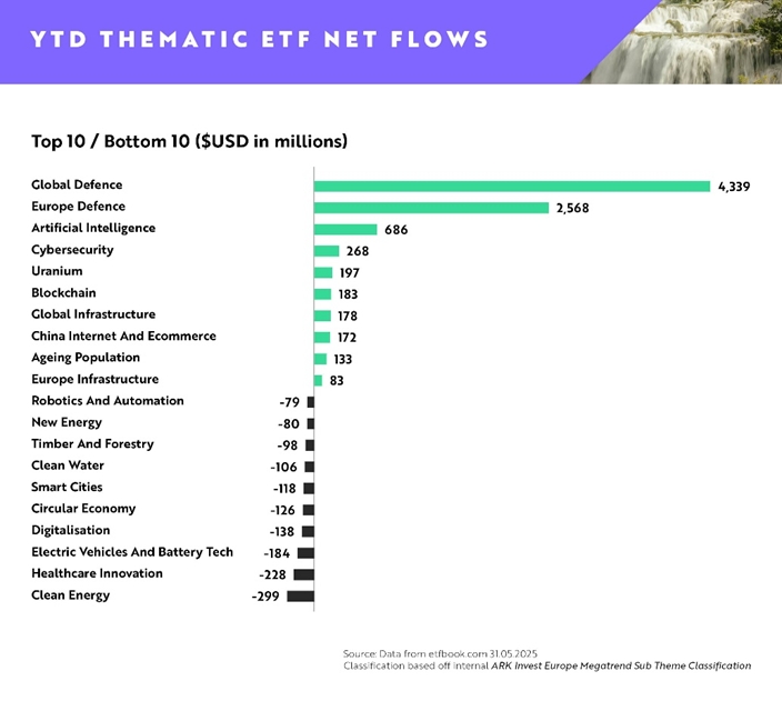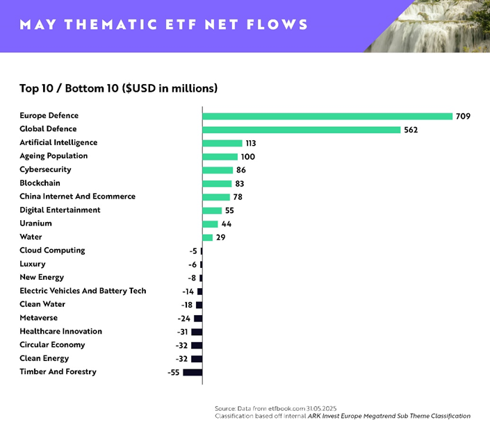 ARK Invest : A maggio 2025 gli afflussi netti sugli ETF tematici sono stati ancora positivi, con un saldo di +1,77 miliardi di dollari.