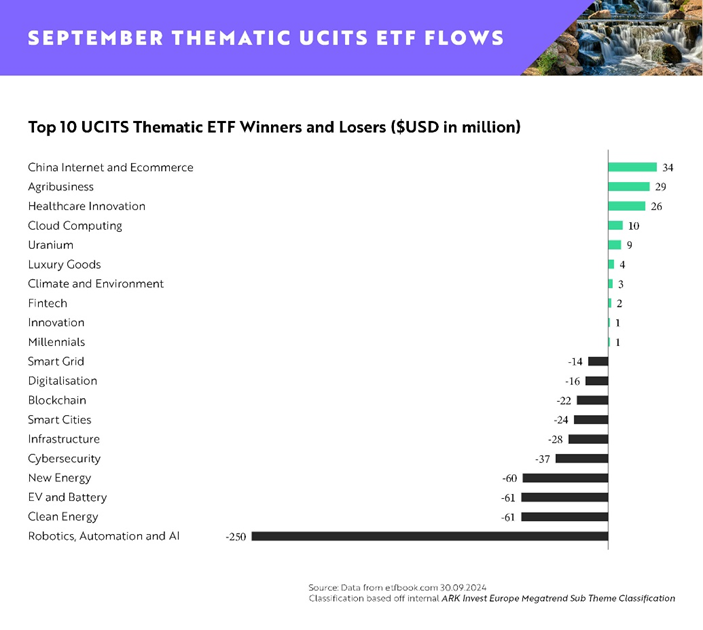 Sul fronte degli afflussi, emergono alcune sorprese: in testa a settembre con 34 milioni c’è il tema China Internet & Ecommerce, con gli investitori che hanno cercato opportunità in vista del pacchetto di stimoli annunciato dalla Cina. Segue il tema Agribusiness con 29 milioni, sostenuto dall’interesse per le innovazioni in agricoltura e per la sicurezza alimentare. Sale nuovamente sul podio l’Innovazione Sanitaria (26 milioni), riflettendo probabilmente sia la forte performance recente del settore che il suo essere tuttora sottovalutato, vista la sua sensibilità ai tassi. Flussi positivi infine anche su Cloud Computing (10 milioni di dollari), Uranio (9 milioni di dollari) e Beni di lusso (4 milioni di dollari).
