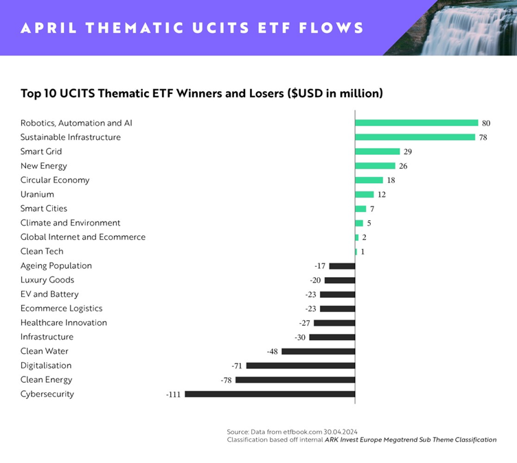 ARK Invest Europe I flussi sugli ETF tematici europei di aprile vedono l’intelligenza artificiale ancora al primo posto, ma per la prima volta con un serio concorrente.