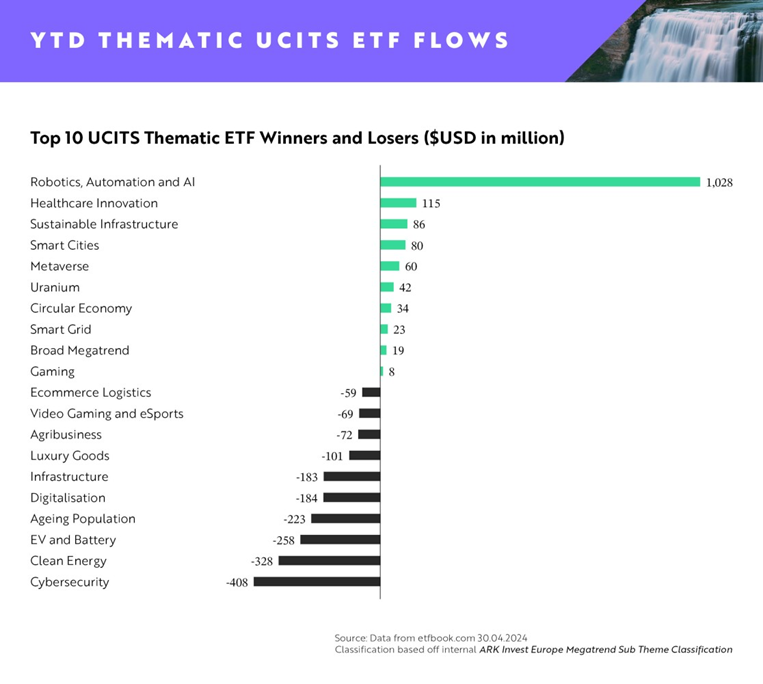 Guardando ai primi 4 mesi del 2024, gli ETF su Robotica, automazione e AI continuano a dominare con oltre 1 miliardo di dollari di afflussi. L’impressionante performance di questo tema ne sottolinea il ruolo chiave assunto nei portafogli di chi cerca un’esposizione alle tecnologie innovative. Al secondo posto, nonostante un aprile in negativo, gli ETF sull’Innovazione sanitaria, con afflussi year-to-date pari a 115 milioni di dollari. L’evoluzione della domanda di assistenza sanitaria e i progressi nel campo dei trattamenti e della diagnostica stanno dunque attirando un crescente interesse da parte degli investitori.