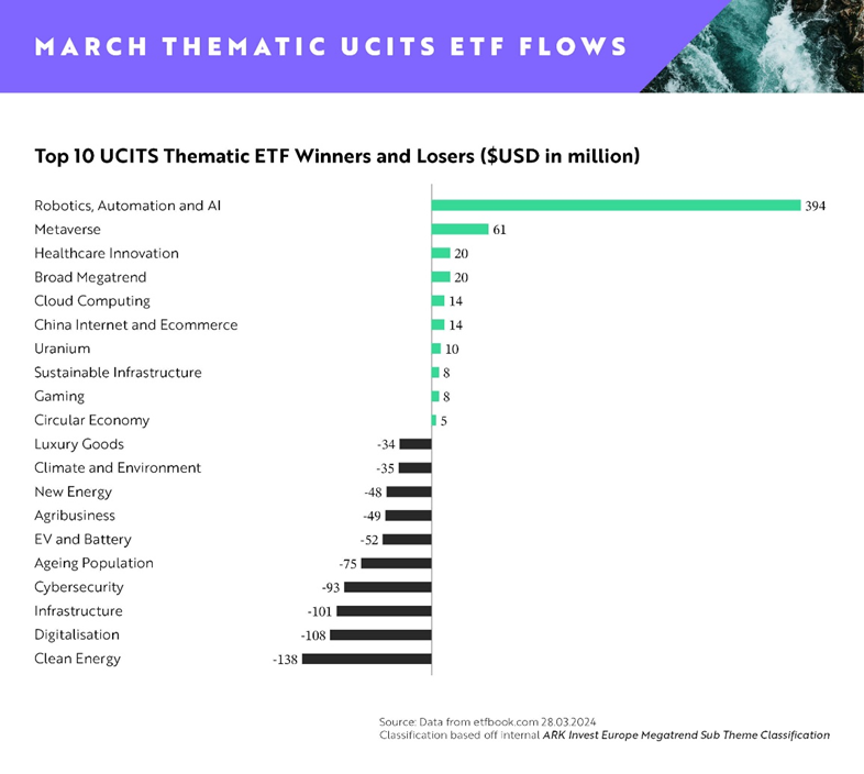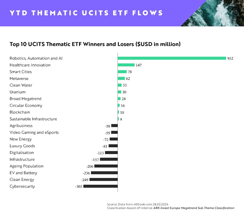 ARK Invest Europe Nei primi tre mesi del 2024, gli afflussi lordi verso gli ETF tematici europei sono stati pari a 1,3 miliardi di dollari, guidati prevalentemente da un singolo tema – Robotica, automazione e AI.