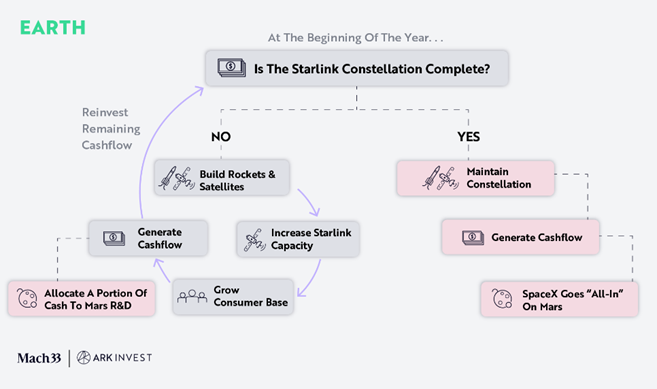 Nel caso base la costellazione Starlink dovrebbe essere completata nel 2035, e le analisi di ARK suggeriscono che a quel punto SpaceX potrebbe generare circa 300 miliardi di dollari di ricavi annui. Il modello assume che a quel punto SpaceX aumenti progressivamente gli investimenti su Marte.