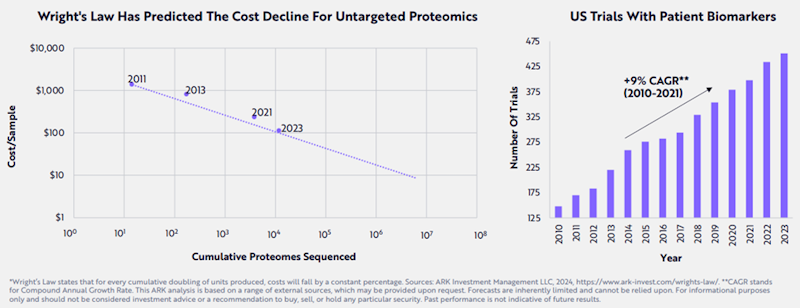 Un altro avanzamento interessante in questo senso è la spettrometria di massa, una tecnica analitica che identifica la composizione di una sostanza ionizzando le proteine e misurando i loro rapporti massa/carica. Con l’aumento del numero di proteomi analizzati con questo approccio, i costi associati alla spettrometria di massa sono diminuiti notevolmente, aprendo nuove possibilità nella ricerca medica e nella diagnostica. La nostra ricerca suggerisce che per la proteomica non mirata che utilizza la spettrometria di massa, il costo per campione diminuisce di circa l’11% per ogni raddoppio cumulativo del numero di proteomi sequenziati, linea con la legge di Wright.