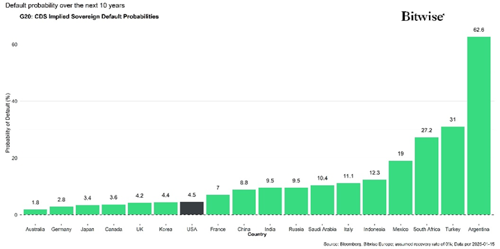 For reference, US sovereign CDS price in a probability of default of around 4.5% over the next 10 years.