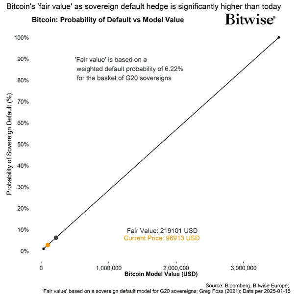 Bitwise : Explore rising sovereign default risks as global debt-to-GDP levels hit record highs, with France and the UK under scrutiny. Discover how Bitcoin, valued at a theoretical fair price of $219k, offers portfolio insurance against major sovereign bond defaults and hyperinflation scenarios. Learn why its decentralized, counterparty risk-free, and scarce nature makes it an appealing hedge for investors.