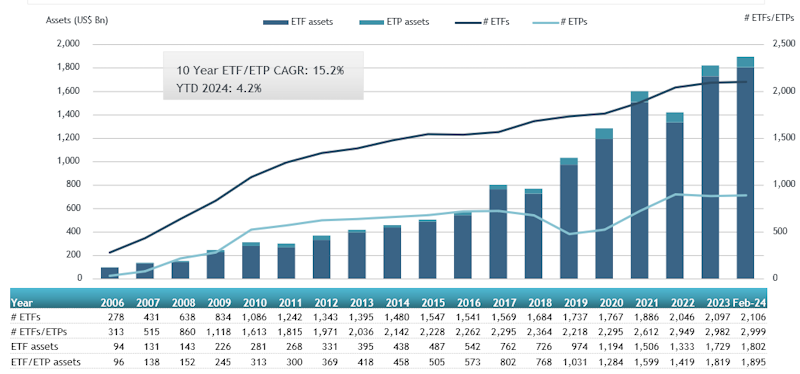 - Assets invested in the Europe ETFs industry reached a new milestone of $1.90 Tn at the end of February beating the previous record of $1.83 Tn at the end of January 2024.