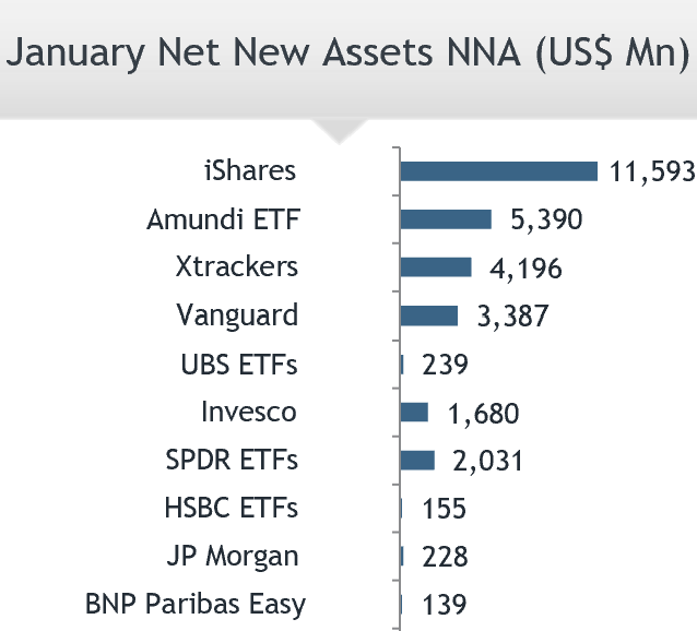 The European ETFs industry gathered $32.93 billion in January. iShares led the way, gathering the largest net inflows with $11.59 billion, followed by Amundi ETF with $5.39 billion, and Xtrackers with $4.20 billion in net inflows.