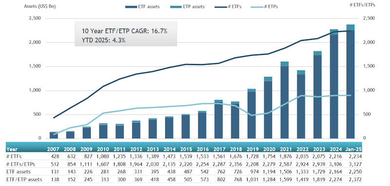 - Assets invested in the ETFs industry in Europe reached a record of $2.37 Tn at the end of January beating the previous record of $2.29 Tn at the end of November 2024.