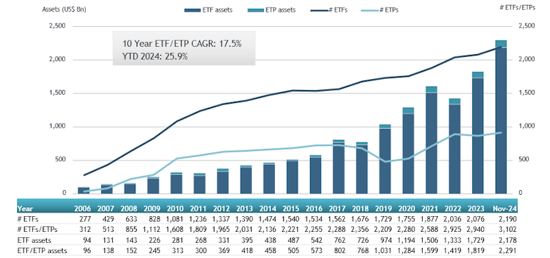 • Assets invested in the ETFs industry in Europe reached a record $2.29 Tn at the end of November beating the previous record of $2.25 Tn at the end of September 2024.