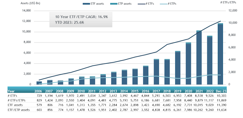 The Global ETFs industry had 11,869 products, with 23,848 listings, assets of $11.63 Tn, from 731 providers listed on 81 exchanges in 63 countries at the end of 2023.