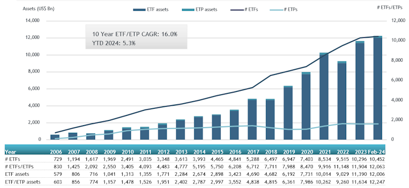 - Assets invested in the global ETFs industry reached a new milestone of $12.25 Tn at the end of February beating the previous record of $11.73 Tn at the end of January 2024.