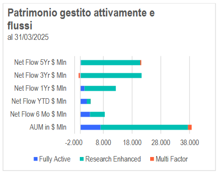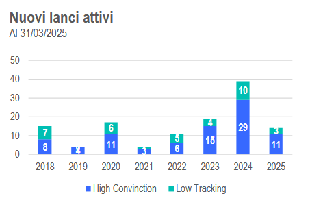 Gli ETF attivi hanno registrato i maggiori afflussi della loro storia nel 2025. Nel primo trimestre, le strategie attive hanno rappresentato circa l’8% di tutti gli afflussi netti, pur costituendo solo il 2,5% del mercato totale. Particolarmente rilevanti sono stati gli ETF azionari attivi high convinction, che hanno rappresentato il 63% degli afflussi da inizio anno.