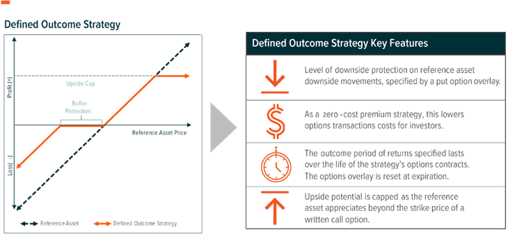 Le strategie defined outcome utilizzano una combinazione di opzioni put e call su un determinato asset. Lo scopo è quello fornire uno specifico livello di protezione dai ribassi mantenendo una partecipazione ai rialzi.