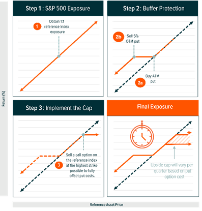 In caso di mercati in ribasso, l’investitore subirà perdite su un periodo trimestrale solo se queste supereranno il 5%. In un trend rialzista, l’investitore riceverà l’intero rialzo dell’S&P 500 fino a un determinato limite massimo, a seconda del prezzo di esercizio della sua covered call.