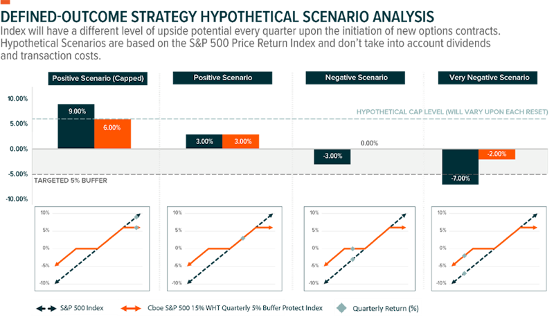 Ad esempio, il Cboe S&P 500 15% WHT Quarterly 5% Buffer Protect Index, tracciato dal Global X S&P 500 Quarterly Buffer UCITS ETF, rappresenta una strategia defined outcome trimestrale con un buffer del 5%.