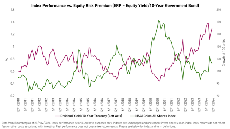 La combinazione di un basso tasso risk-free e di elevati rendimenti da dividendi rende il premio per il rischio azionario estremamente interessante rispetto agli Stati Uniti. I picchi del premio per il rischio azionario, misurato dal rapporto tra il rendimento medio dei dividendi dell’indice MSCI China All Shares e il rendimento del titolo di Stato cinese a 10 anni, tendono a precedere i rally delle azioni cinesi. Questo è esattamente ciò che è accaduto a settembre, dopo che il premio per il rischio azionario ha raggiunto i massimi di dieci anni in agosto. Come si può vedere nel grafico sottostante, il premio per il rischio azionario ha una forte correlazione inversa con i rendimenti del mercato azionario cinese.