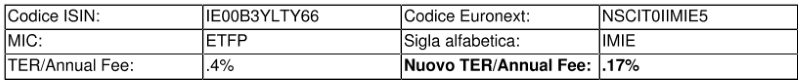 Nella tabella pubblicata di seguito vengono indicati per i dati salienti dell’ETF in oggetto