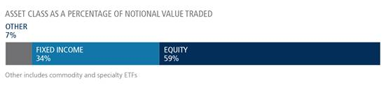 As a percentage of total notional value, equities accounted for 59% and fixed income for 34%, with the remainder comprising commodity and specialty ETFs.