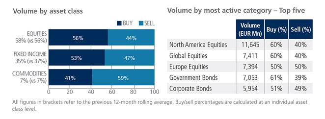 In November, commodities was the only ETF asset class where ‘sells’ exceeded ‘buys’ by eighteen percentage points, while equities and fixed income saw net buying. Trading activity in equity-based ETFs rose to 58% of the total traded volume from 54% in the month prior. Similarly to October, North American Equities was the most heavily-traded ETF category, with EUR 11.6 billion in total notional volume.
