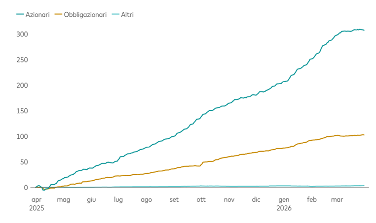 - Il contributo degli azionari è stato di 10,8 miliardi di dollari mentre quello degli obbligazionari di 1,1 miliardi di dollari.