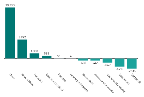 Fonte: ETFbook, al 31 marzo 2026. La categoria ‘segmento’ comprende esposizioni azionarie mirate a specifici segmenti di capitalizzazione di mercato come small-cap, mid-cap e large-cap. La categoria ‘accesso al mercato’ comprende mercati di difficile accesso come i mercati emergenti. La categoria ‘paniere’ comprende strategie che hanno come esposizione sottostante gruppi di titoli.