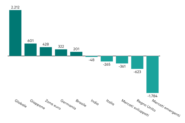 Raccolta mensile dei prodotti azionari per esposizione geografica (in milioni di dollari)