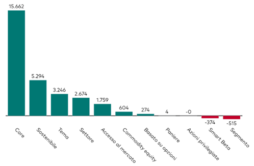 Fonte: ETFbook, al 31 ottobre 2025. La categoria ‘segmento’ comprende esposizioni azionarie mirate a specifici segmenti di capitalizzazione di mercato come small-cap, mid-cap e large-cap. La categoria ‘accesso al mercato’ comprende mercati di difficile accesso come i mercati emergenti. La categoria ‘paniere’ comprende strategie che hanno come esposizione sottostante gruppi di titoli.