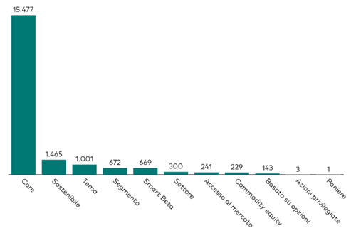 Fonte: ETFbook, al 31 agosto 2025. La categoria ‘segmento’ comprende esposizioni azionarie mirate a specifici segmenti di capitalizzazione di mercato come small-cap, mid-cap e large-cap. La categoria ‘accesso al mercato’ comprende mercati di difficile accesso come i mercati emergenti. La categoria ‘paniere’ comprende strategie che hanno come esposizione sottostante gruppi di titoli.