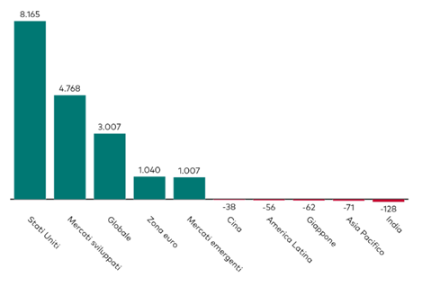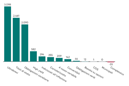 • Il contributo dei prodotti azionari è stato di 20,2 miliardi di dollari e quello degli obbligazionari di 9,2 miliardi di dollari.