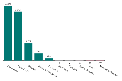 Raccolta mensile dei prodotti obbligazionari per area geografica di esposizione (milioni di dollari)