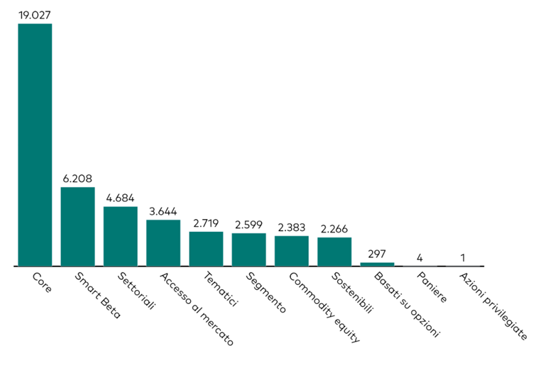 Fonte: ETFbook al 31 gennaio 2026. La categoria ‘segmento’ comprende esposizioni azionarie mirate a specifici segmenti di capitalizzazione di mercato come small-cap, mid-cap e large-cap. La categoria ‘accesso al mercato’ comprende mercati di difficile accesso come i mercati emergenti. La categoria ‘paniere’ comprende strategie che hanno come esposizione sottostante gruppi di titoli.