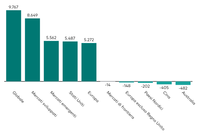 Raccolta mensile dei prodotti azionari per esposizione geografica (in milioni di dollari)