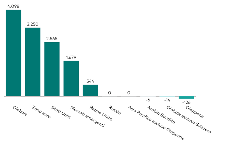 Raccolta mensile dei prodotti obbligazionari per area geografica di esposizione (milioni di dollari)