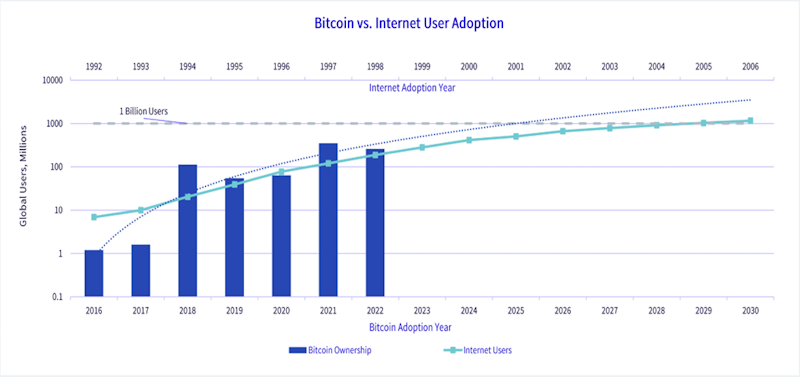 Nella Figura 1, l’asse orizzontale superiore rappresenta l’adozione di internet su una linea temporale che va dal 1992 al 2006. Nel 1992, internet rappresentava una novità e aveva 10 milioni di utenti. La persona media sarebbe stata riluttante a fornirgli i dati della propria carta di credito. Nel 2006, internet aveva superato il miliardo di utenti e grandi aziende come Google e Amazon.com erano sulla buona strada per accaparrarsi le loro enormi fette di valore economico. Se passiamo all’asse orizzontale inferiore, vediamo la linea temporale relativa alla titolarità dei bitcoin. Si stima che nel 2016 ci fossero circa 1 milione di “titolari” e che, entro il 2022, tale cifra aveva superato i 100 milioni. La curva, pur non essendo esattamente la stessa dell’adozione di internet, è simile.