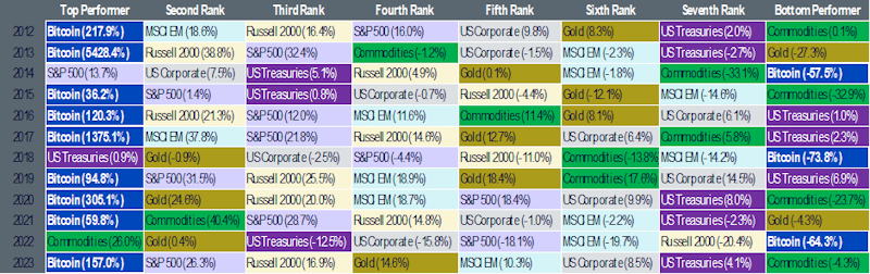 • in nove dei 12 anni che mostriamo, il bitcoin ha avuto il rendimento complessivo più forte, e con un margine tutt’altro che esiguo. In questi nove anni il rendimento del bitcoin ha nettamente superato quello dell’asset class successiva.