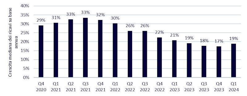 - la crescita mediana dei ricavi ha subito un’accelerazione fino al terzo trimestre del 2021. In seguito, la tendenza ha visto una decelerazione, passando dal 33% circa a un minimo del 17% nel quarto trimestre del 2023;