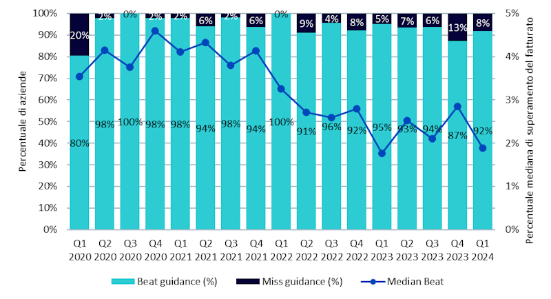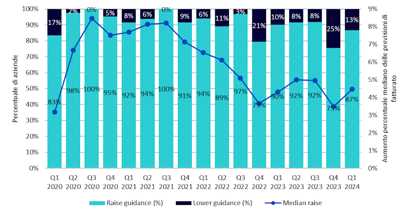 Le cifre suggeriscono un po’ più di movimento; ad esempio, nel quarto trimestre del 2023, la percentuale di aumento delle previsioni è passata dal 92% al 75%. Si nota anche come l’aumento mediano delle previsioni di fatturato sia passato da un intervallo del 7-8% a un livello più vicino al 4-5%.