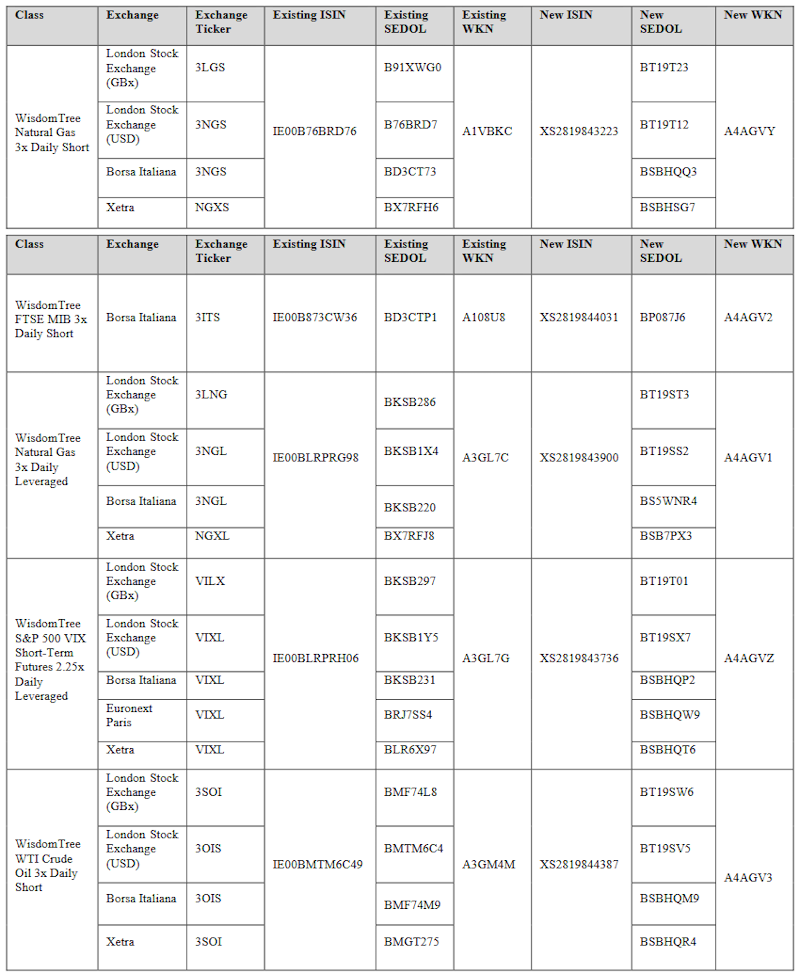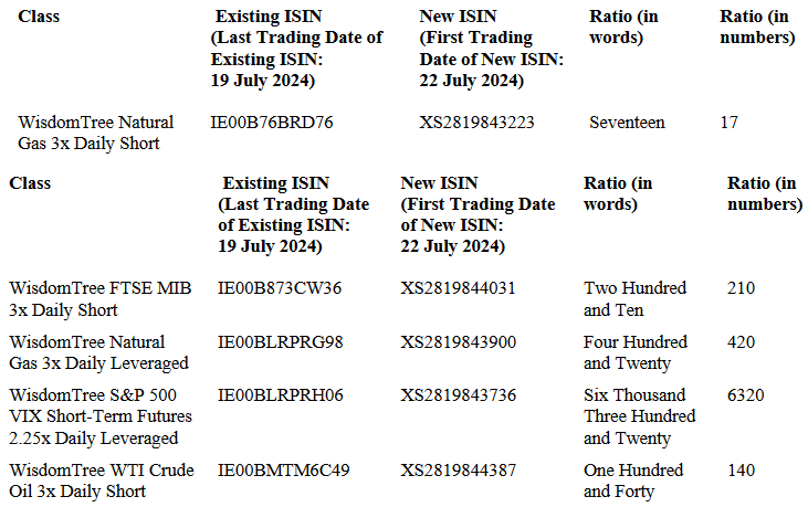 WisdomTree Multi Asset Issuer Public Limited Company annuncia che, ai sensi della Condizione 17.2, effettuerà una scissione alla chiusura delle attività del 19 luglio 2024 della seguente classe di Titoli Collateralizzati Exchange Traded Product (“ETP”):