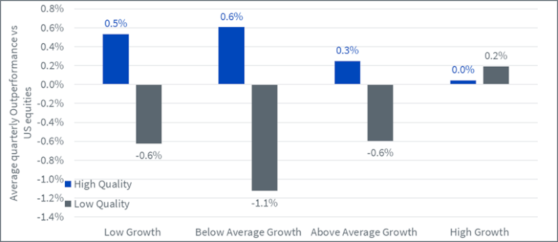 Il grafico 1 si concentra sulla performance dei titoli di alta e bassa qualità rispetto al livello di crescita dell’economia. Suddividiamo i trimestri in 4 quartili, da quelli a bassa crescita a quelli ad alta crescita, e calcoliamo la sovraperformance o sottoperformance di tali titoli nel trimestre successivo a quello in cui la crescita è stata osservata. Notiamo innanzitutto la resilienza delle aziende di alta qualità. Mentre le aziende di bassa qualità sovraperformano solo quando l’economia funziona a pieno regime, le aziende di alta qualità sovraperformano in tutti e 4 i contesti. I titoli di alta qualità registrano le sovraperformance migliori quando la crescita è bassa o inferiore alla media.