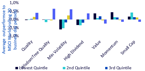Il nostro al fattore Quality offre un mix molto equilibrato con una forte sovraperformance nei mercati ad alta volatilità, che contribuisce a ridurre i drawdown e i tempi di ripresa, ma anche una certa sovraperformance in altri regimi di volatilità. Questa combinazione è quella che tendiamo a ritenere “adatta a qualsiasi contesto”. Una strategia di questo tipo può essere utilizzata comodamente come partecipazione strategica per rimanere nel mercato, in quanto coglie la maggior parte dei rialzi, proteggendo al tempo stesso dai ribassi.