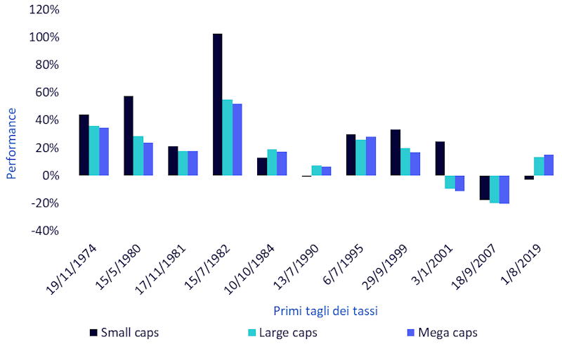 - Inoltre, nei due cicli in cui le azioni hanno registrato una performance negativa, le small cap hanno battuto le large cap e persino le mega cap, registrando addirittura rendimenti positivi in uno di questi due casi.