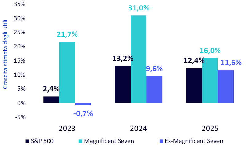 In secondo luogo, il divario riguardante le aspettative di crescita degli utili tra i “Magnifici Sette” e il resto del mercato si ridurrà significativamente verso la fine dell’anno. Sebbene i Magnifici Sette abbiano registrato una crescita degli utili molto più elevata nel 2023 e nella prima metà del 2024, il resto del mercato sta recuperando terreno. Le stime per i due gruppi nel quarto trimestre del 2024 e nel 2025 sono sostanzialmente simili. Questo dovrebbe offrire l’opportunità ai titoli che esulano dalle sette mega cap di cogliere l’attenzione degli investitori e recuperare.