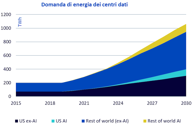 L’aumento delle applicazioni di IA sta determinando una domanda senza precedenti di centri dati, che a loro volta richiedono grandi quantità di energia. L’investimento di Amazon nei centri dati, pari a 150 miliardi di dollari per i prossimi 15 anni, sottolinea questa tendenza. Entro il 2030, si prevede che l’IA farà aumentare la domanda di energia dei centri dati del 160% (cfr. figura in basso).
